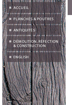 Cet endroit, cest la Ferme du Trappeur. Vous y trouverez des planches de tous les formats, faites du bois de vieilles et honorables granges, du bois dont la patine du temps a rendu lapparence unique et remarquable... Des poutres de couleurs introuvables dans le commerce et dune solidité à toute épreuve. Vous trouverez aussi chez-nous, des milliers dobjets dantiquités achetés à travers les rangs et les routes rurales de nombre de régions au Québec et ailleurs. Du bibelot à la charrue de laboureur, en passant par des chaises, des miroirs, des outils, des traîneaux, des bob-sleighs, etc. Aussi, si vous avez besoin de faire démolir une grange ou un hangar, de les faire rénover ou den faire bâtir des complètement neufs, nous avons lexpertise et les capacités logistiques et mécaniques pour ce faire. |